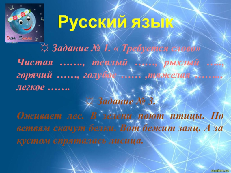 Русский язык☼ Задание № 1. « Требуется слово»Чистая ……., теплый ……, рыхлый ….., горячий ……, голубое ……