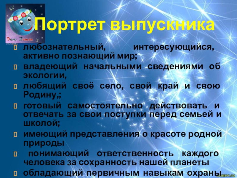 Портрет выпускникалюбознательный, интересующийся, активно познающий мир;владеющий начальными сведениями об экологии, любящий своё село, свой край и свою