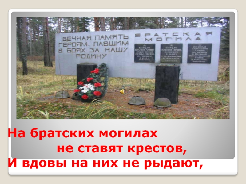 Слайд 2На братских могилах не ставят крестов, И вдовы на них не рыдают,