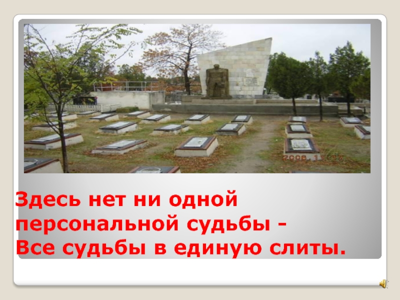 Слайд 6 Здесь нет ни одной персональной судьбы - Все судьбы в единую слиты.