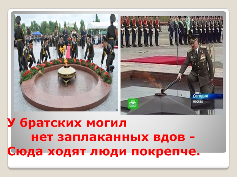 Слайд 11У братских могил нет заплаканных вдов - Сюда ходят люди покрепче.