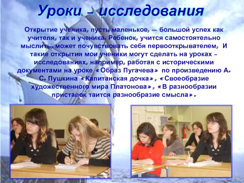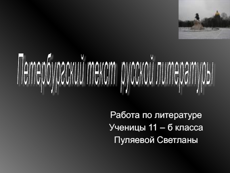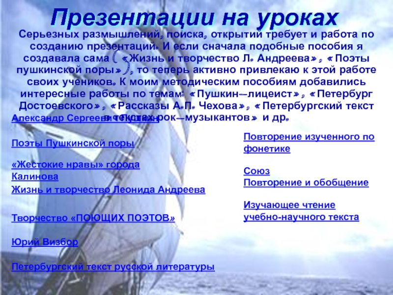 Серьезных размышлений, поиска, открытий требует и работа по созданию презентаций. И если сначала подобные пособия я создавала сама («Жизнь и творчество Л. Андреева», «Поэты пушкинской поры»), то теперь активно привлекаю к этой работе своих учеников. К моим методическим пособиям добавились интересные работы по темам: «Пушкин-лицеист», «Петербург Достоевского», «Рассказы А.П. Чехова», «Петербургский текст в текстах рок-музыкантов» и др.