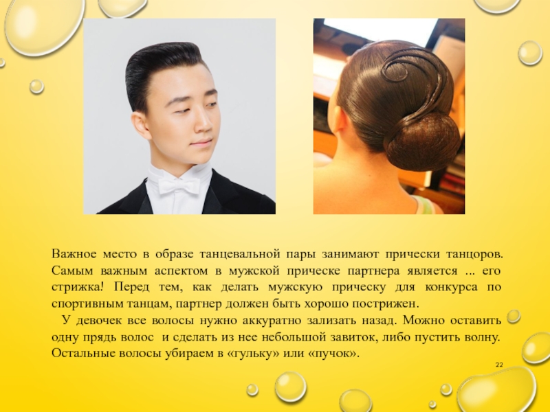 Слайд 22Важное место в образе танцевальной пары занимают прически танцоров.