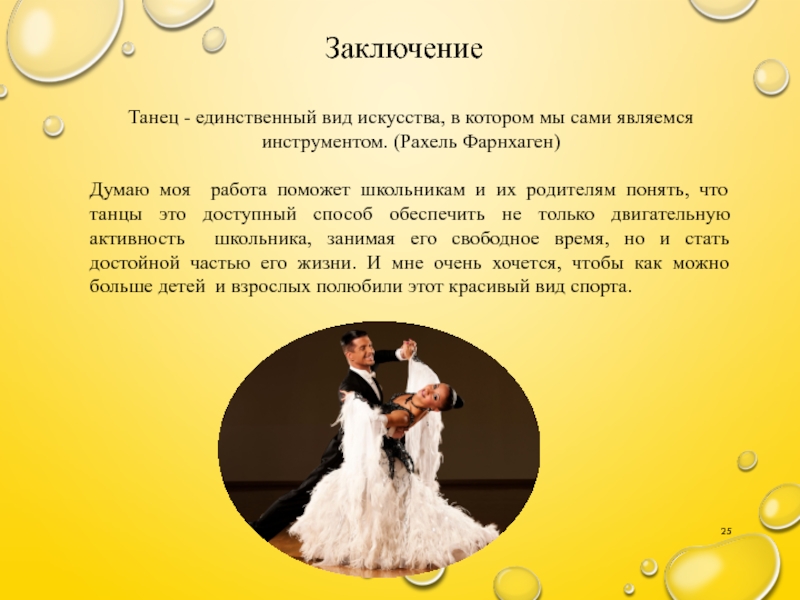 Думаю моя работа поможет школьникам и их родителям понять, что танцы это доступный способ обеспечить не только двигательную активность школьника, занимая его свободное время, но и стать достойной частью его жизни. И мне очень хочется, чтобы как можно больше детей и взрослых полюбили этот красивый вид спорта.