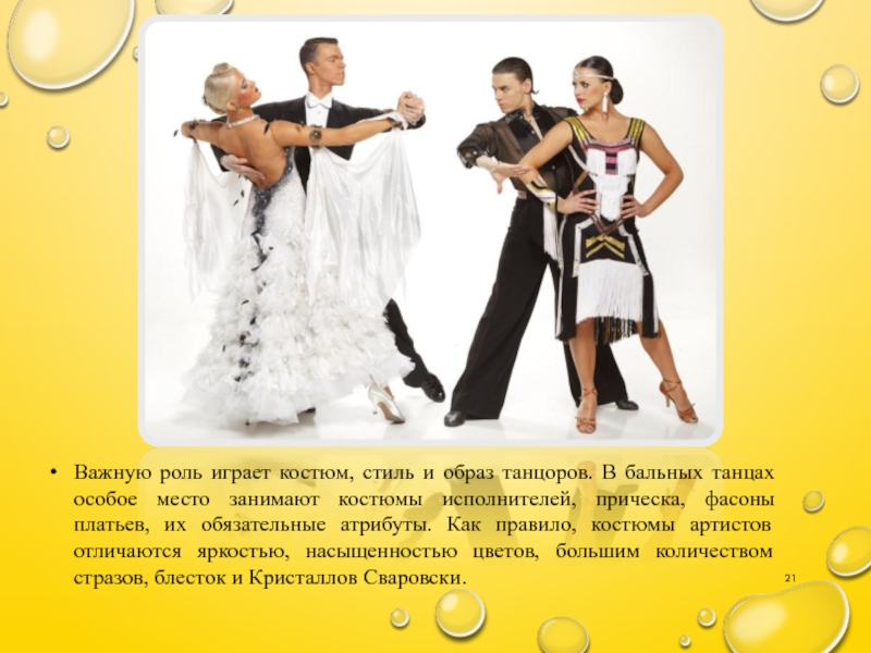 Слайд 21Важную роль играет костюм, стиль и образ танцоров. В бальных танцах