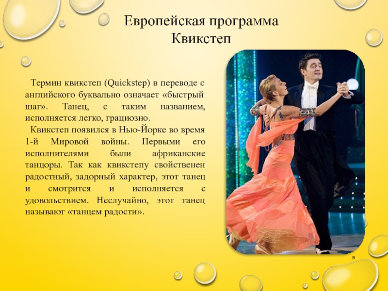 Квикстеп появился в Нью-Йорке во время 1-й Мировой войны. Первыми его исполнителями были африканские танцоры. Так как квикстепу свойственен радостный, задорный характер, этот танец и смотрится и исполняется с удовольствием. Неслучайно, этот танец называют «танцем радости».