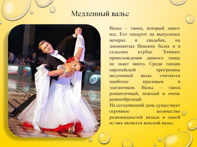 вечерах и свадьбах, на знаменитых Венских балах и в сельских клубах. Точного происхождения данного танца не знает никто. Среди танцев европейской программы медленный вальс считается наиболее красивым и элегантным. Вальс – танец романтичный, нежный и очень разнообразный.