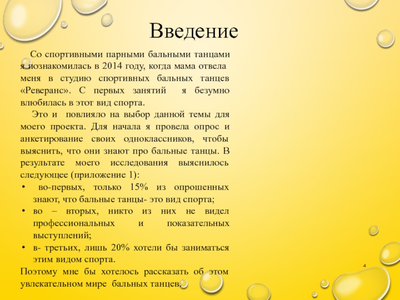 Это и повлияло на выбор данной темы для моего проекта. Для начала я провела опрос и анкетирование своих одноклассников, чтобы выяснить, что они знают про бальные танцы. В результате моего исследования выяснилось следующее (приложение 1):