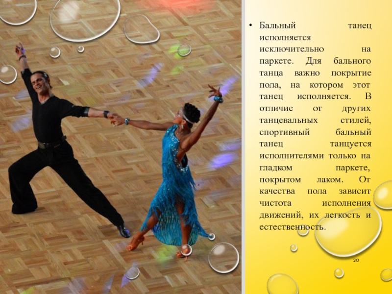 Слайд 20Бальный танец исполняется исключительно на паркете. Для бального танца важно покрытие