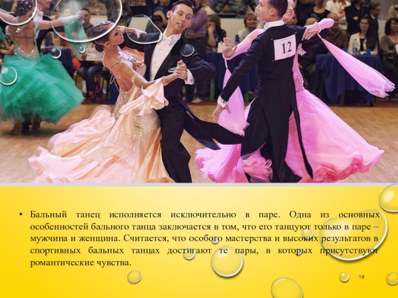 Слайд 19Бальный танец исполняется исключительно в паре. Одна из основных особенностей бального