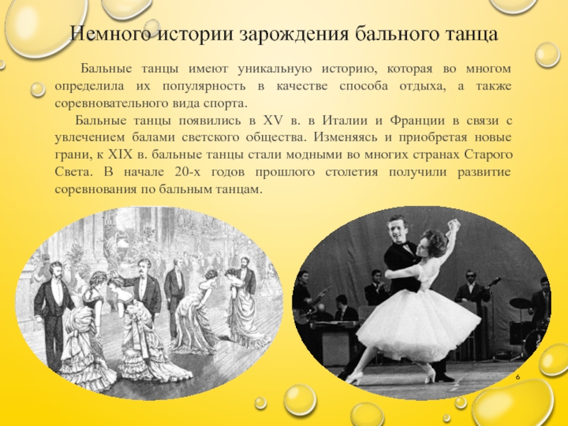 Бальные танцы появились в XV в. в Италии и Франции в связи с увлечением балами светского общества. Изменяясь и приобретая новые грани, к XIX в. бальные танцы стали модными во многих странах Старого Света. В начале 20-х годов прошлого столетия получили развитие соревнования по бальным танцам.