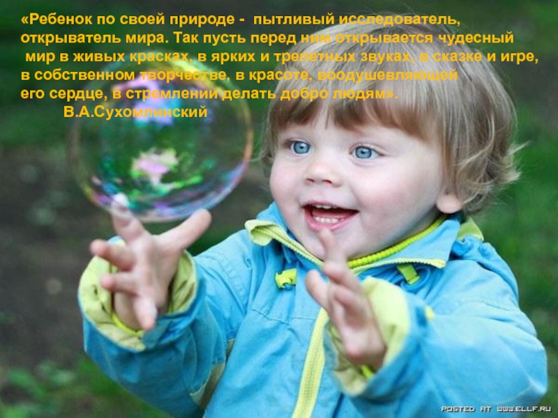 «Ребенок по своей природе - пытливый исследователь, открыватель мира. Так пусть перед ним открывается чудесный мир в