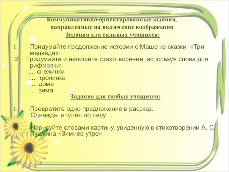 Слайд 7Коммуникативно-ориентированные задания, направленные на включение воображения