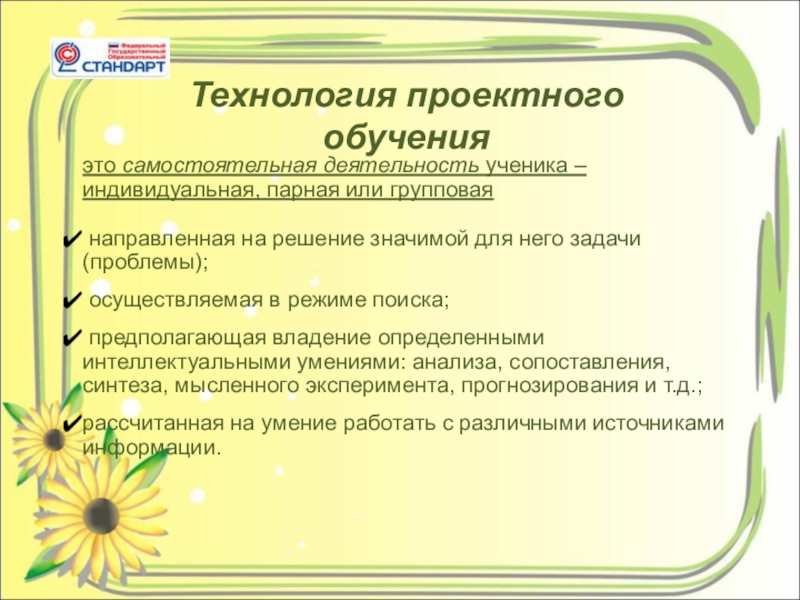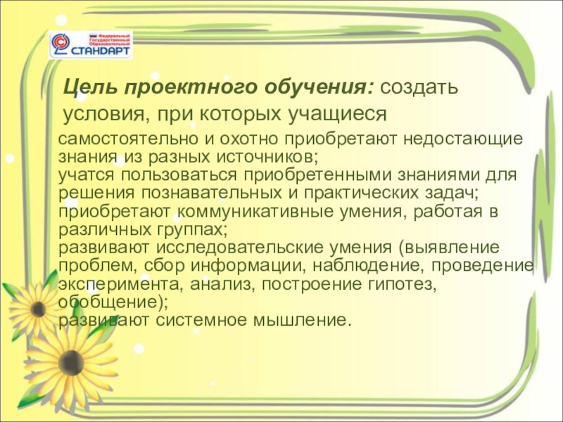 Слайд 34Цель проектного обучения: создать условия, при которых учащиеся