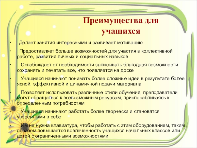 ∙ Позволяет использовать различные стили обучения, преподаватели могут обращаться к всевозможным ресурсам, приспосабливаясь к определенным потребностям