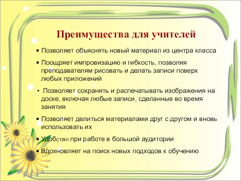 ∙ Освобождает от необходимости записывать благодаря возможности сохранять и печатать все, что появляется на доске