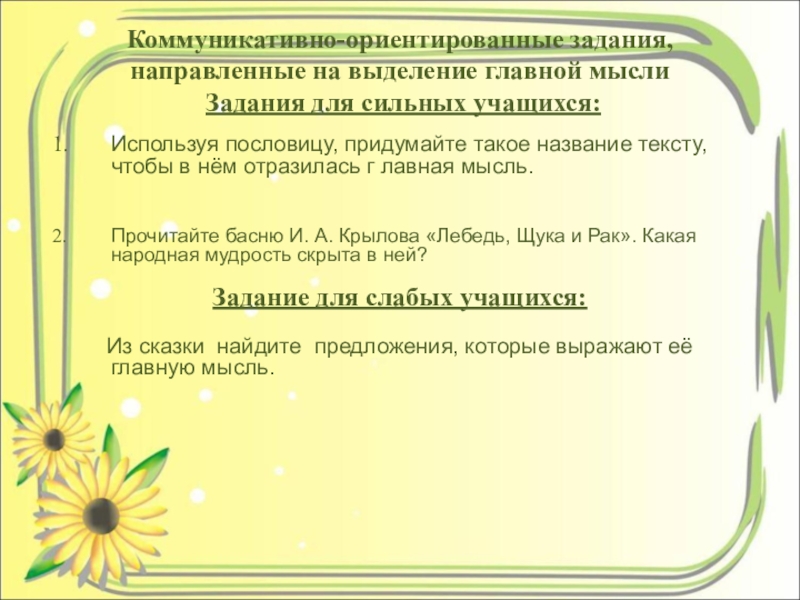 Слайд 8Коммуникативно-ориентированные задания, направленные на выделение главной мысли