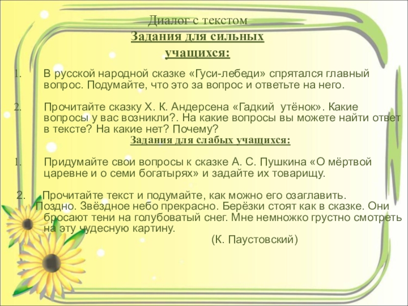Прочитайте сказку Х. К. Андерсена «Гадкий утёнок». Какие вопросы у вас возникли?. На какие вопросы вы можете найти ответ в тексте? На какие нет? Почему?