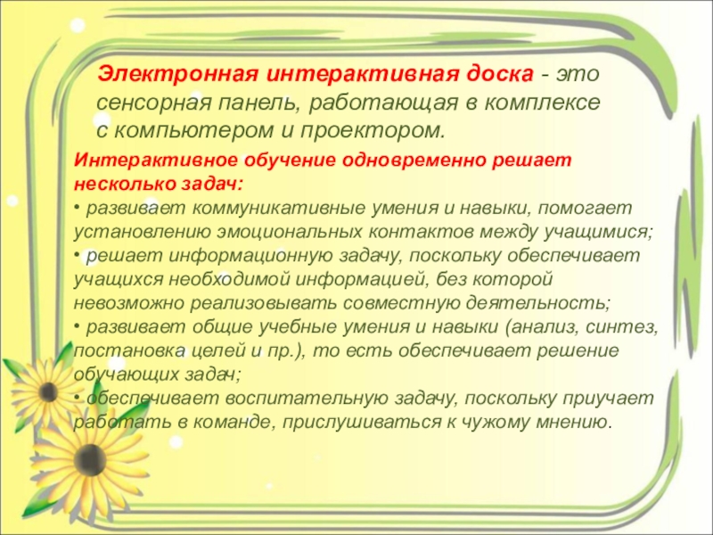 Слайд 29Электронная интерактивная доска - это сенсорная панель, работающая в комплексе с