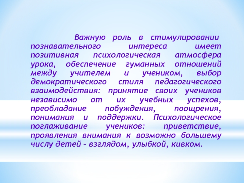позитивная психологическая атмосфера урока, обеспечение гуманных отношений между учителем и учеником, выбор демократического стиля педагогического взаимодействия: принятие своих учеников независимо от их учебных успехов, преобладание побуждения, поощрения, понимания и поддержки. Психологическое поглаживание учеников: приветствие, проявления внимания к возможно большему числу детей – взглядом, улыбкой, кивком.