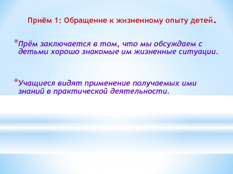 Слайд 7Приём 1: Обращение к жизненному опыту детей.