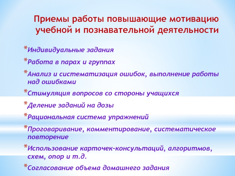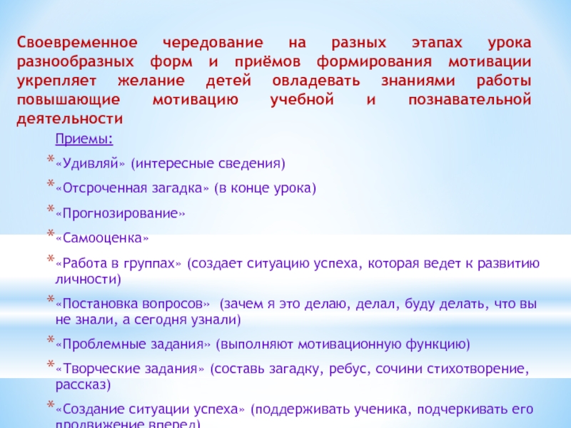 Слайд 13Приемы работы повышающие мотивацию учебной и познавательной деятельности