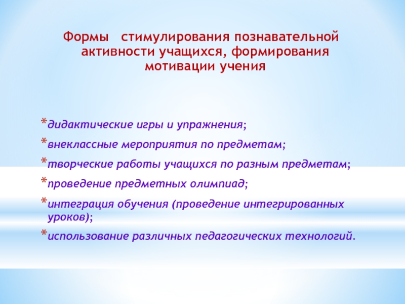 Слайд 12Формы стимулирования познавательной активности учащихся, формирования мотивации учения
