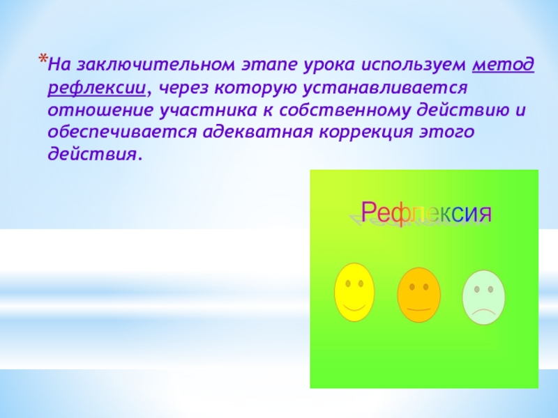 Слайд 22На заключительном этапе урока используем метод рефлексии, через которую устанавливается отношение