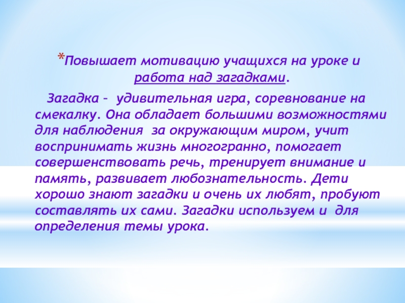 Слайд 16Повышает мотивацию учащихся на уроке и работа над загадками.