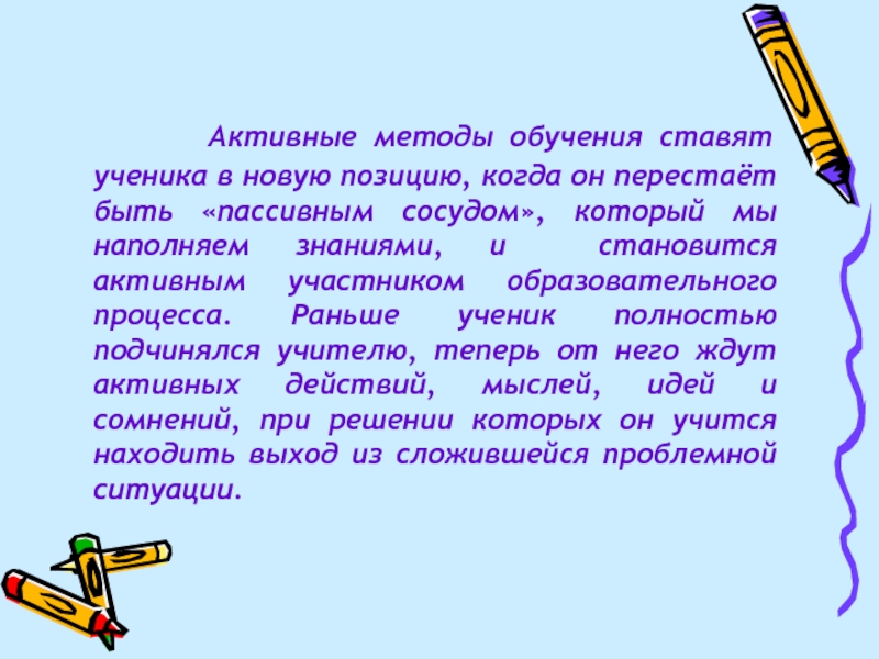 Слайд 24 Активные методы обучения ставят ученика в новую позицию,