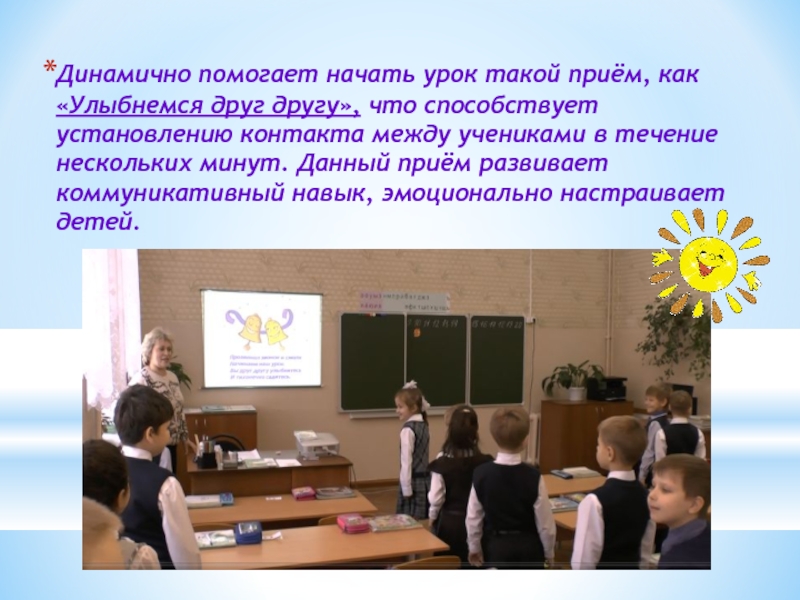 Слайд 15Динамично помогает начать урок такой приём, как «Улыбнемся друг другу», что