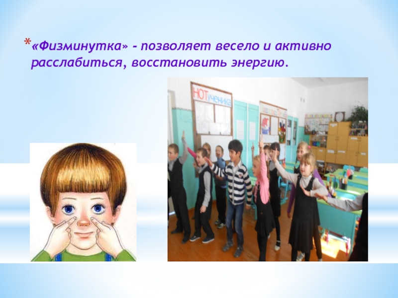 Слайд 18«Физминутка» - позволяет весело и активно расслабиться, восстановить энергию.
