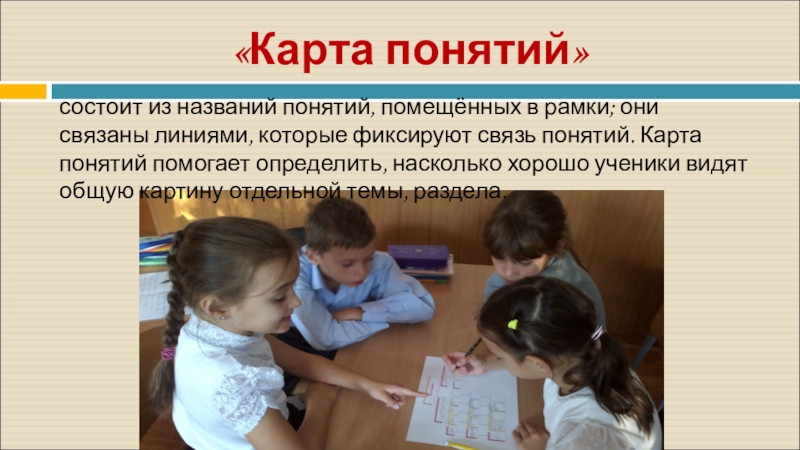 которые фиксируют связь понятий. Карта понятий помогает определить, насколько хорошо ученики видят общую картину отдельной темы, раздела.