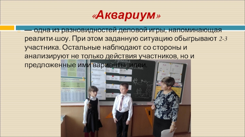 ситуацию обыгрывают 2-3 участника. Остальные наблюдают со стороны и анализируют не только действия участников, но и предложенные ими варианты, идеи.