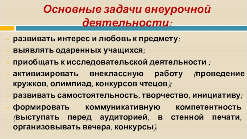 активизировать внеклассную работу (проведение кружков, олимпиад, конкурсов чтецов);
