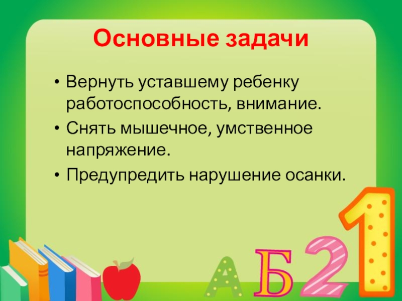 Основные задачиВернуть уставшему ребенку работоспособность, внимание.Снять мышечное, умственное напряжение.Предупредить нарушение осанки.