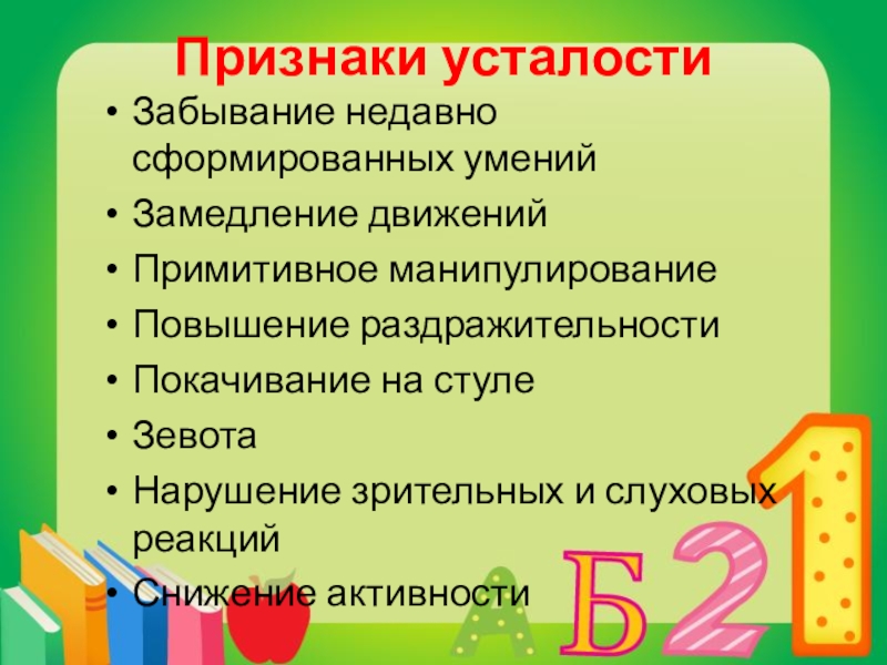 Признаки усталостиЗабывание недавно сформированных уменийЗамедление движенийПримитивное манипулированиеПовышение раздражительностиПокачивание на стулеЗевотаНарушение зрительных и слуховых реакцийСнижение активности