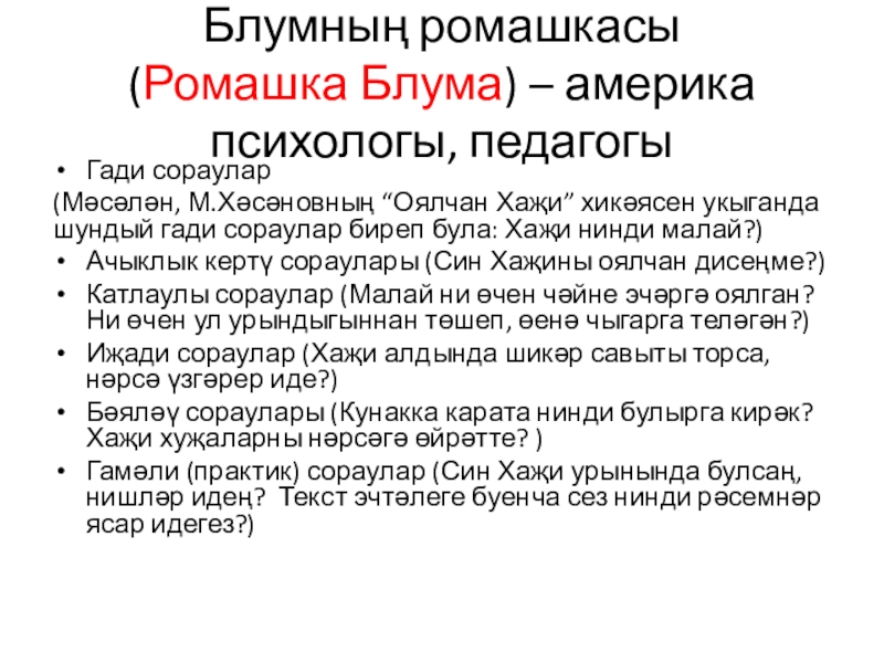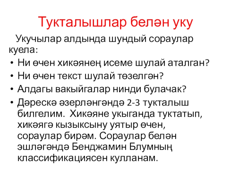 Дәрескә әзерләнгәндә 2-3 тукталыш билгелим. Хикәяне укыганда туктатып, хикәягә кызыксыну уятыр өчен, сораулар бирәм. Сораулар белән эшләгәндә Бенджамин Блумның классификациясен кулланам.
