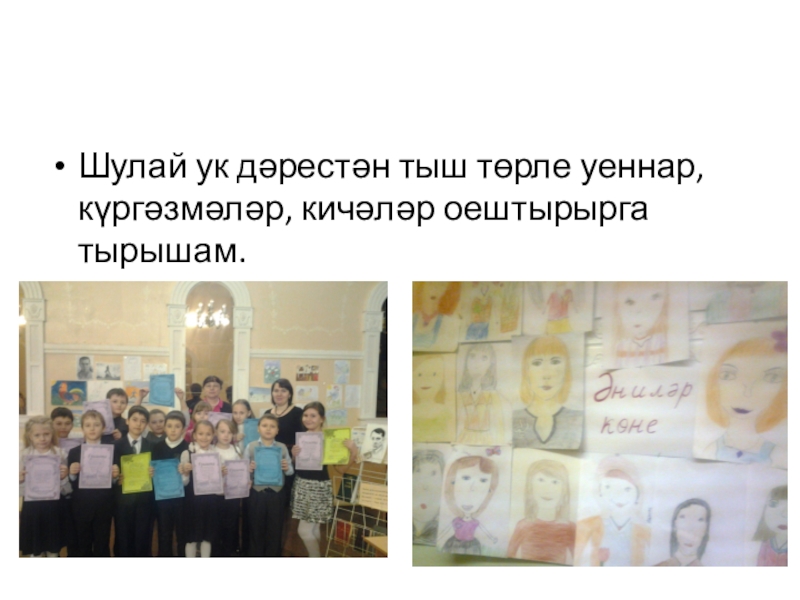 Слайд 10Шулай ук дәрестән тыш төрле уеннар, күргәзмәләр, кичәләр оештырырга тырышам.