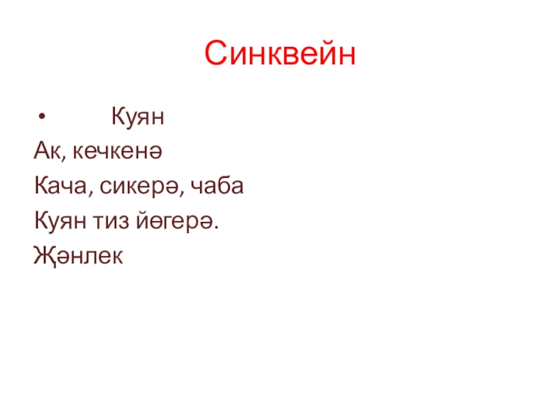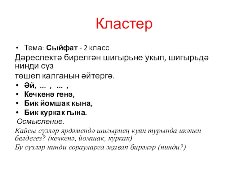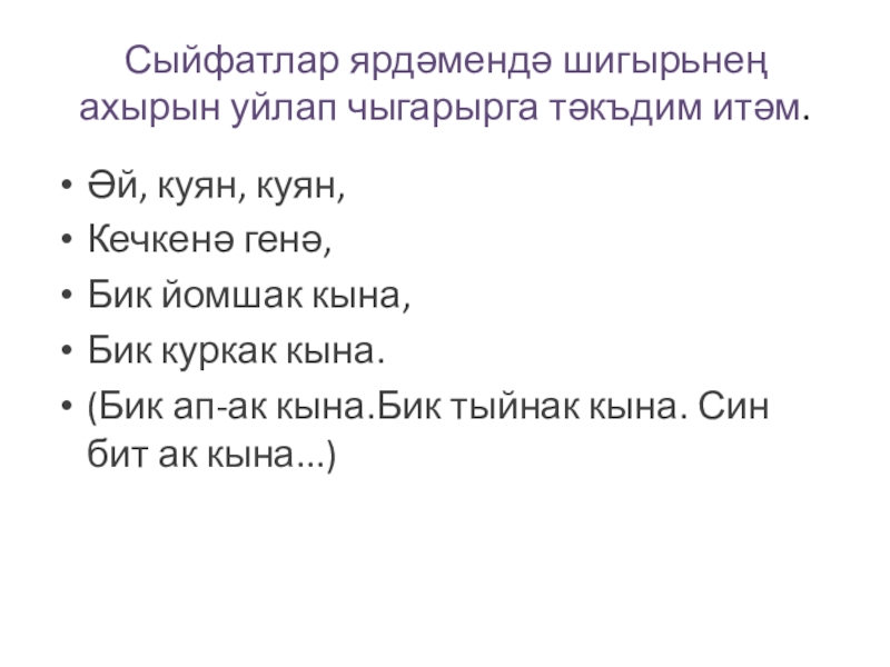 Слайд 20Сыйфатлар ярдәмендә шигырьнең ахырын уйлап чыгарырга тәкъдим итәм.