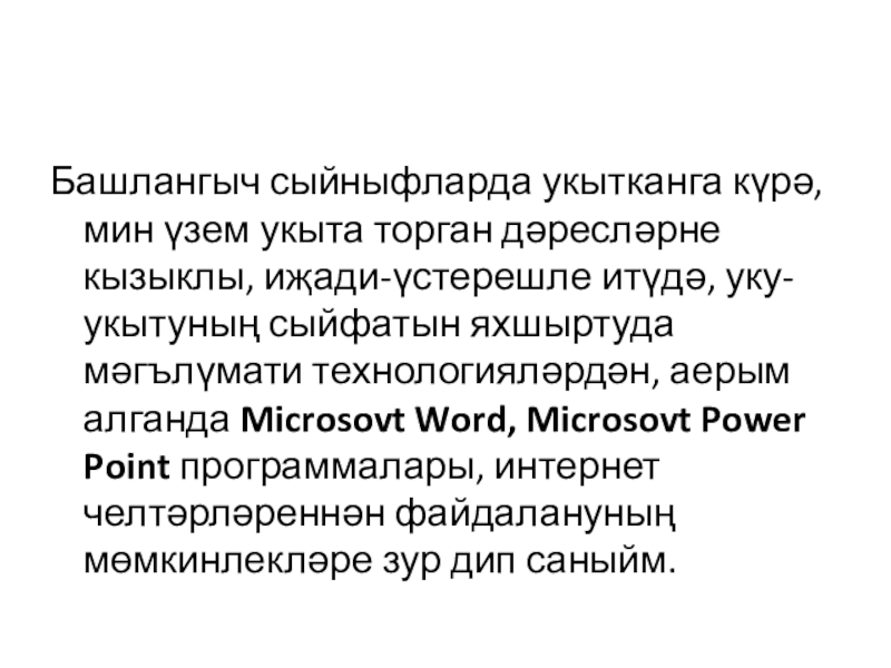 итүдә, уку-укытуның сыйфатын яхшыртуда мәгълүмати технологияләрдән, аерым алганда Microsovt Word, Microsovt Power Point программалары, интернет челтәрләреннән файдалануның мөмкинлекләре зур дип саныйм.