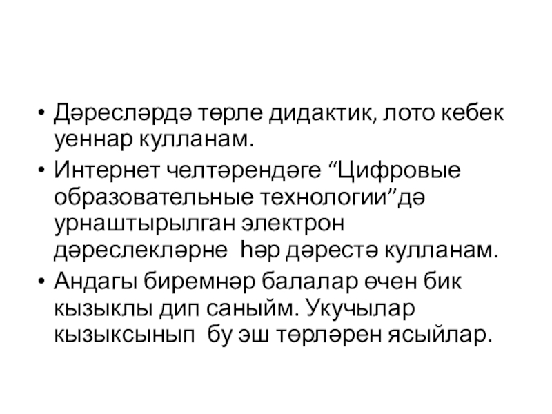 Слайд 6Дәресләрдә төрле дидактик, лото кебек уеннар кулланам.