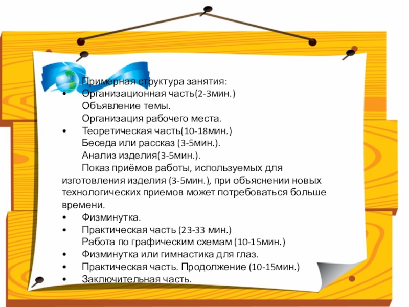 Показ приёмов работы, используемых для изготовления изделия (3-5мин.), при объяснении новых технологических приемов может потребоваться больше времени.