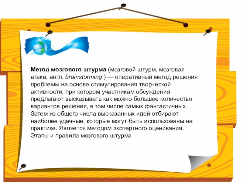 Слайд 14Метод мозгового штурма (мозговой штурм, мозговая атака, англ. brainstorming ) — оперативный метод решения