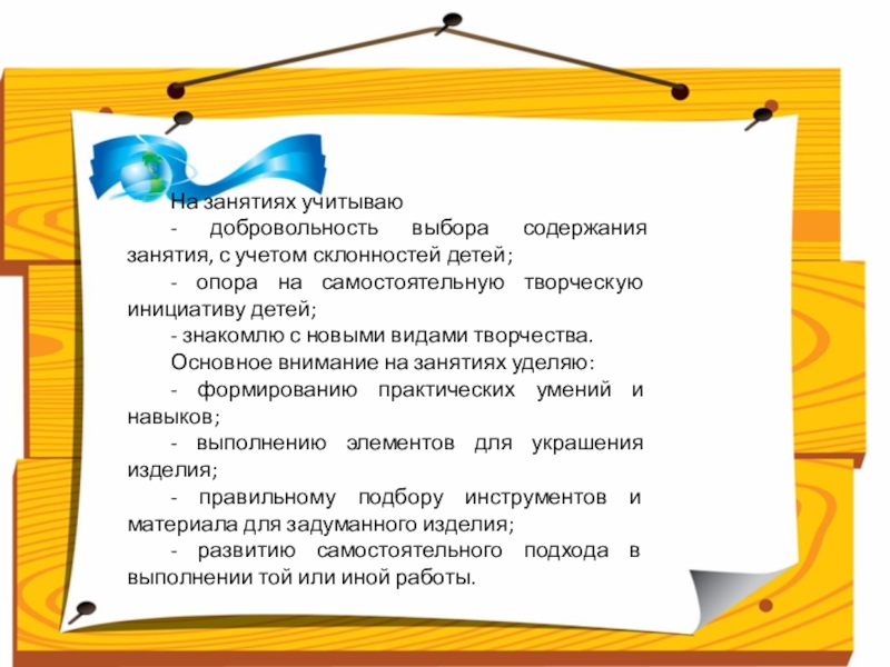 - добровольность выбора содержания занятия, с учетом склонностей детей;