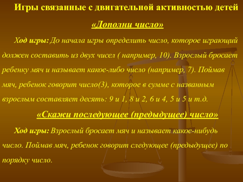 Игры связанные с двигательной активностью детей«Дополни число»Ход игры: До начала игры определить число, которое играющий должен составить