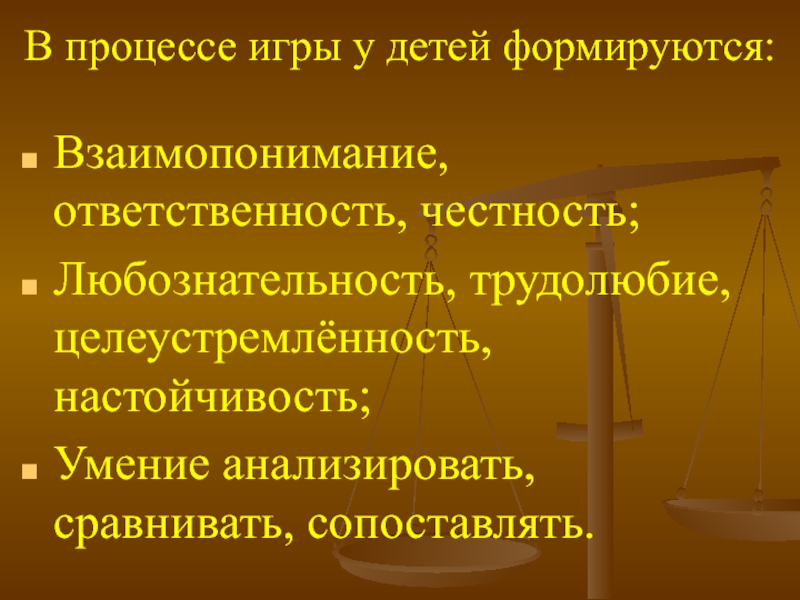 В процессе игры у детей формируются: Взаимопонимание, ответственность, честность;Любознательность, трудолюбие, целеустремлённость, настойчивость;Умение анализировать, сравнивать, сопоставлять.