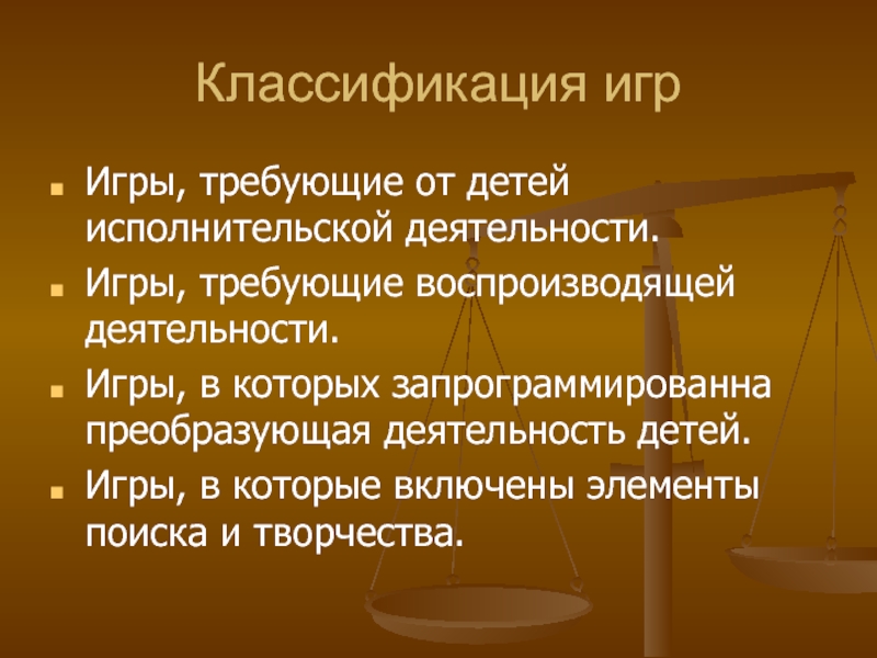 Классификация игрИгры, требующие от детей исполнительской деятельности.Игры, требующие воспроизводящей деятельности.Игры, в которых запрограммированна преобразующая деятельность детей.Игры, в