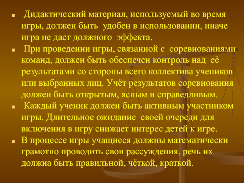 В процессе игры учащиеся должны математически грамотно проводить свои рассуждения, речь их должна быть правильной, чёткой, краткой.