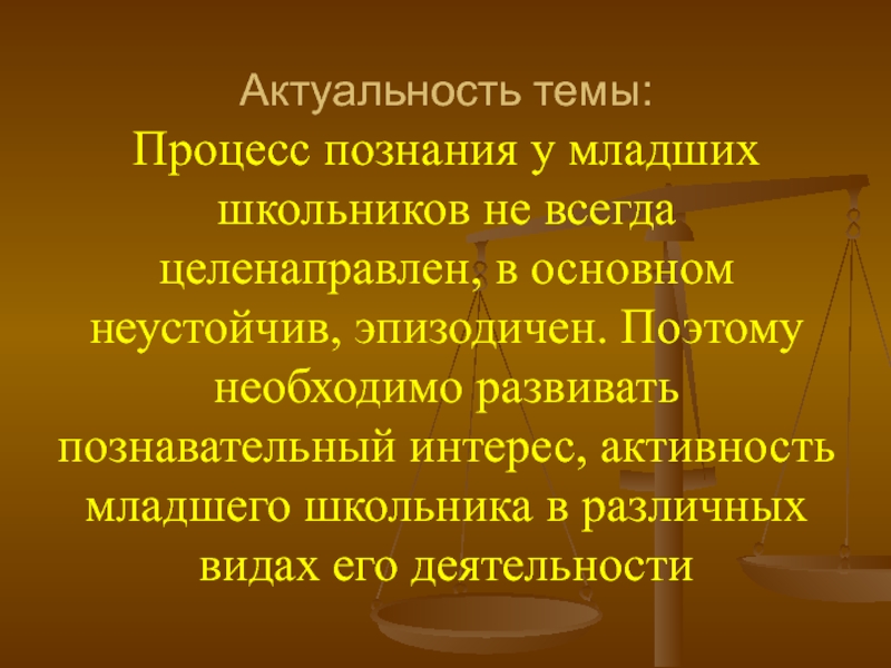 Актуальность темы: Процесс познания у младших школьников не всегда целенаправлен, в основном неустойчив, эпизодичен. Поэтому необходимо развивать познавательный интерес, активность младшего школьника в различных видах его деятельности
